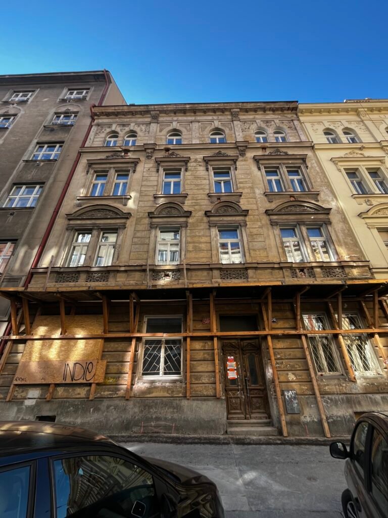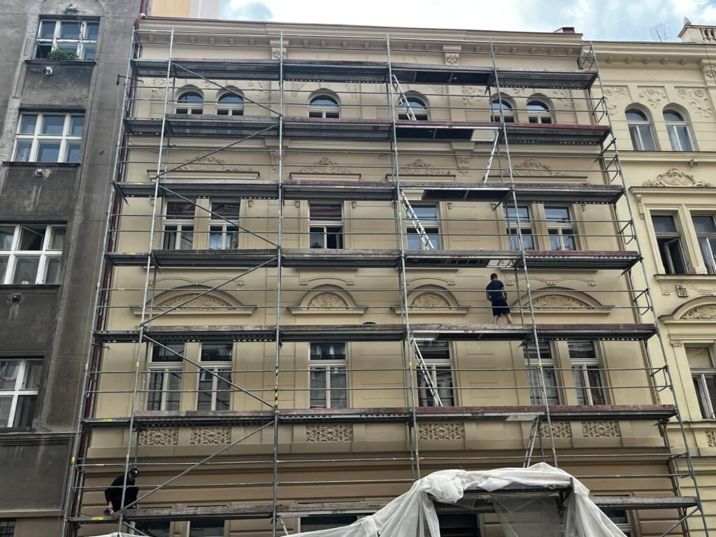 Projekt zahrnoval komplexní obnovu fasády historického bytového domu. Práce začaly částečným oklepáním omítek, zpevněním podkladních vrstev a jejich doplněním vápennými omítkami s příměsí cementu do 5 %, včetně závěrečného přeštukování.